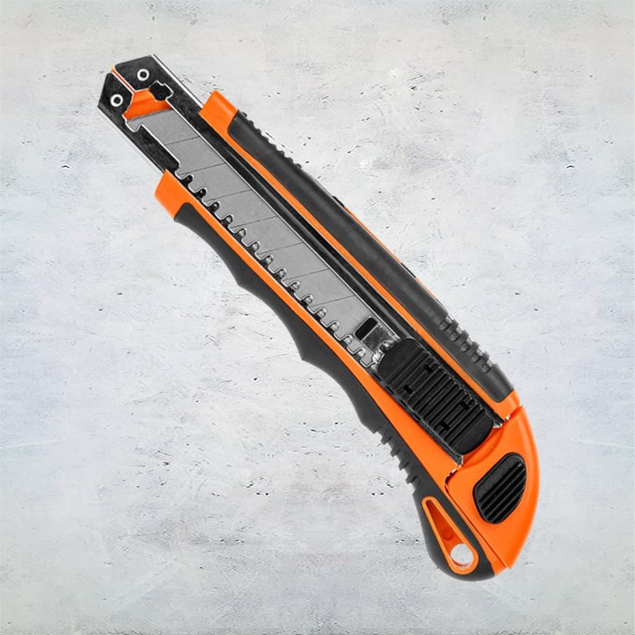 Нож пистолетный с выдвижным лезвием, металлической направляющей, механизмом автоматической фиксации сменного лезвия и автоматической смены лезвия. Для разрезания бумаги, картона, линолеума, кожи и прочих материалов.